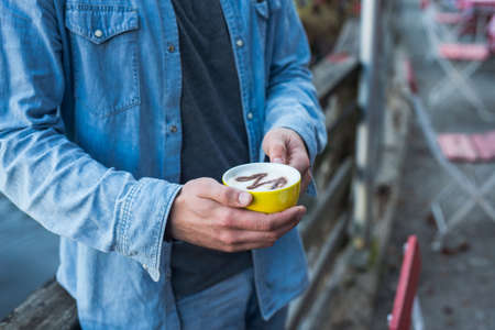 Man with a yellow cup of coffee, morning by the river on the pier with hot drink