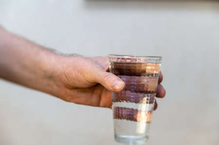 Close-up of a hand holding a tall glass of water against a gray background. A mature man with dirty, untidy fingernails. Glass of clear drinking water.
