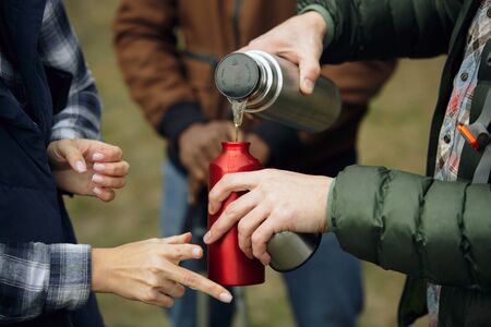 Group of friends on a camping or hiking trip in autumn day. Men and women with touristic backpacks in the forest, talking, laughing. Leisure activity, friendship, weekend. Drink tea or coffee.