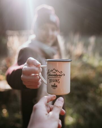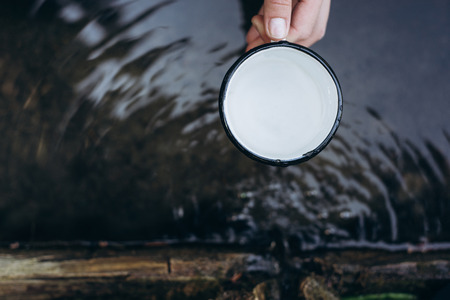 Woman's hand holds a mug of spring water in the forest. Concept adventure active vacations outdoor. Camping