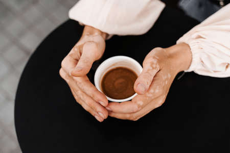 Hands with vitiligo skin pigmentation holding cup of coffee on black background close-up. Lifestyle with skin seasonal diseases