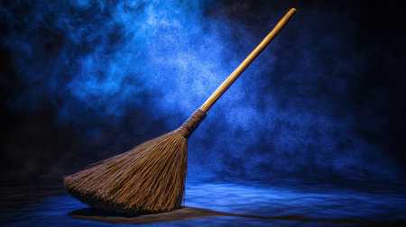 This image features a rustic wooden broom with bristles set against a dark background, enhanced by blue fog and light effects, ideal for creative projects.