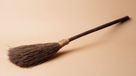 A traditional wooden broom featuring natural bristles, set against a soft neutral background. Ideal for themes around cleaning, home decor, and rustic elegance.