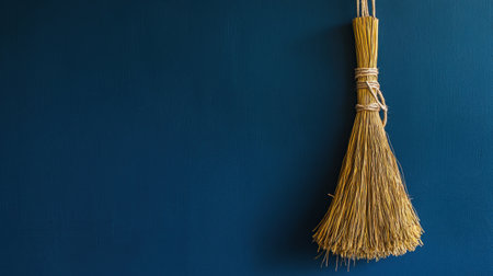 A rustic broom made of straw hangs gracefully against a dark blue wall, showcasing a simple yet artistic arrangement that enhances indoor spaces.