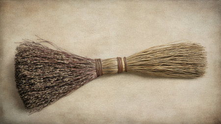 A rustic broom featuring natural bristles and a wooden handle, set against a textured vintage background full of character and warmth.