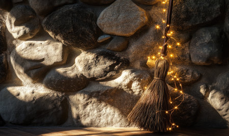 Witch's broom adorned with glowing garlands