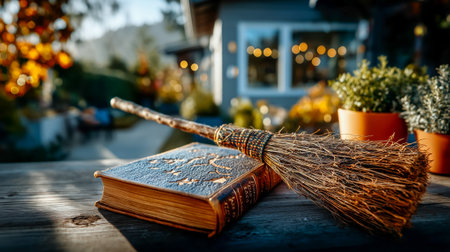 A classic Halloween prop, this high-resolution image captures a witch's broomstick leaning against a wall Perfect for festive decorations, Halloween-themed photos, and projects needing spooky imagery Add a touch of whimsy and magic to your designs with this versatile image AI Generative