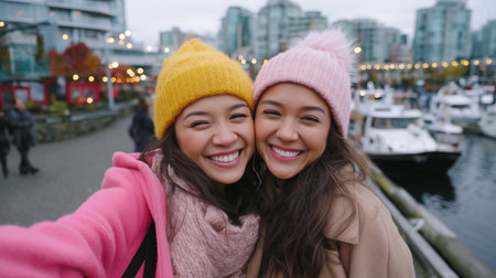 Friends enjoy a cheerful day by the waterfront in Vancouver, sharing smiles and warmth during winter