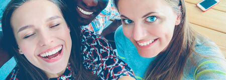 Multicultural group of taking friends selfie picture outside , Happy young people smiling at camera together , Friendship concept with guys and girls hanging in city street.
