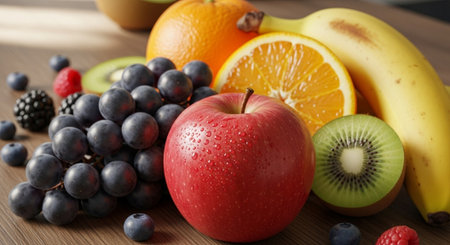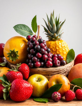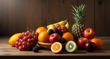 A vibrant arrangement of fresh fruit on a wooden table. The colorful selection includes pineapple, oranges, apples, pears, grapes, and berries.