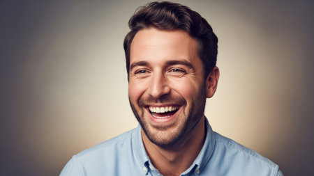 A close-up portrait showcases a smiling man. The man's facial features and brown hair are emphasized against a simple backdrop. This image captures a moment of happiness. Potential applications include commercial and editorial uses related to business, lifestyle, or marketing.