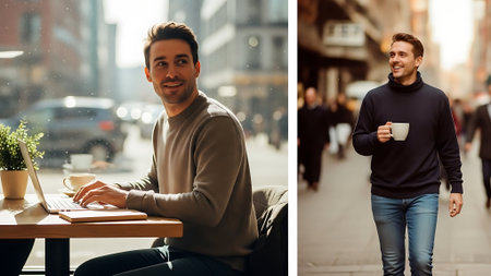 Portrait of a man in a black shirt in a cafe.