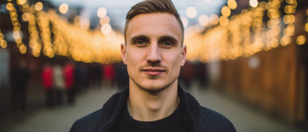Portrait of a handsome young man on a blurred background with lights.