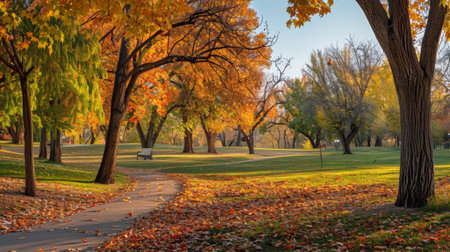 A serene autumnal scene of a pathway through a park with trees displaying vibrant orange leaves