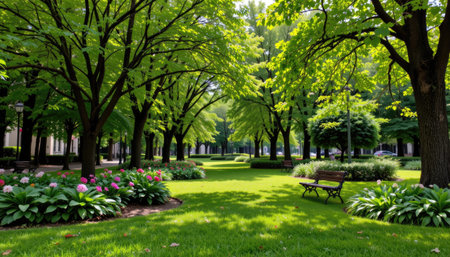 A picturesque park setting featuring vibrant greenery, tall trees, and colorful flower beds, ideal for relaxation and enjoying nature's beauty.