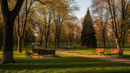 A serene park scene showcases rows of wooden benches nestled amongst tall trees with lush green foliage. Sunlight softly illuminates the scene, creating a warm, inviting atmosphere. The composition emphasizes natural elements, potentially suitable for editorial content or promotional materials related to relaxation and leisure.
