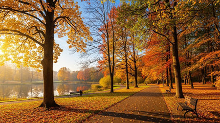 Autumn Park Pathway with Colorful Trees and Fallen Leaves at Sunset