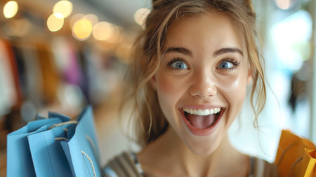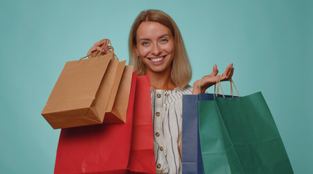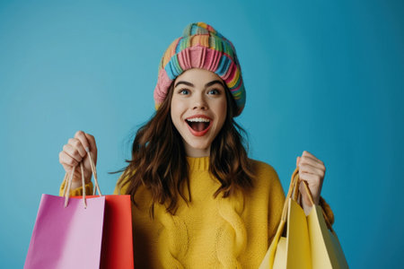A joyful young woman stands against a blue background, holding multiple shopping bags in vibrant colors. She radiates positivity, showcasing the excitement of shopping during the commerce season.