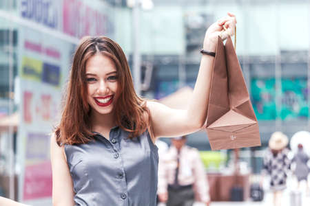 Woman with paper bags enjoy shopping