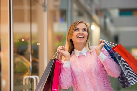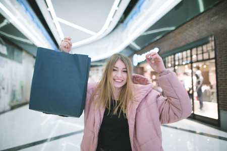 A smiling blonde girl raised shopping bags up while shopping in the mall. Shopping concept