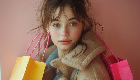 Portrait of a young woman with shopping bags on a pink background