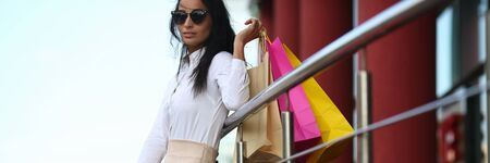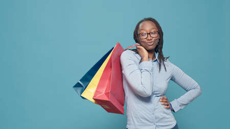 Portrait of female model holding shopping bags after buying clothes on sale discount from retail store at mall. Shopaholic woman paying to buy things in colorful paperbags, posing.