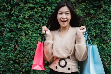 Happy beautiful asian woman with shopping bags enjoying in shopping. Lifestyle shopping and business concept.