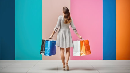 Young woman with shopping bags against color wall background, Generative AI