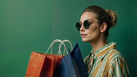 Beautiful young woman in sunglasses with shopping bags on a green background