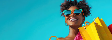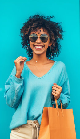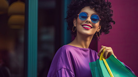 A vivacious and cheerful lady full of zest gazes at the camera with bright eyes and an infectious laugh. She clutches a vivid purple shopping bag the color resonating with her lively spirit. The woman is wearing stylish sunglasses that add a playful touch. Her outfit is a dynamic mix of vibrant purples and blues. The background is a flat sunny yellow studio.