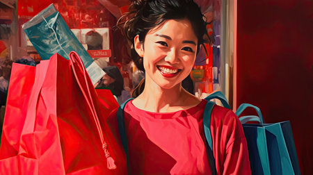 A vibrant smile illuminates the face of a happy woman as she navigates a bustling street market Her arms are laden with colorful bags, each one a treasure trove of unique finds The thrill of the hunt, the joy of discovery, and the promise of great deals fill her with AI Generative