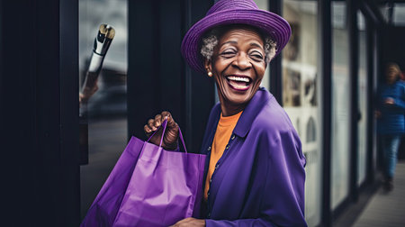 A single shopper stylishly dressed stands outside a boutique. She holds a vibrant purple shopping bag and exudes joy and contentment. Her laughter is contagious.