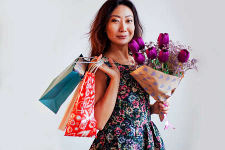 Cheerful smiling asian woman holding lot of shopping paper bag with one hand.