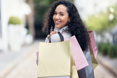 Smiling young woman standing at outdoor with shopping bags.