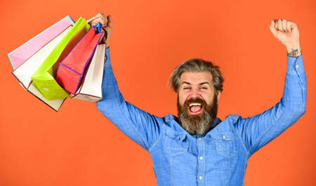Quality service. Joyful man enjoying online shopping. happy hipster after shopping. bearded brutal man hold packages. ready to celebrate holidays. male fashion sale. savings on purchases