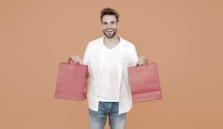 guy happy about his purchase. successful shopping online. male shopper hold packages. shopping bag with goods. How to save money while sale. cyber monday concept. goods for men