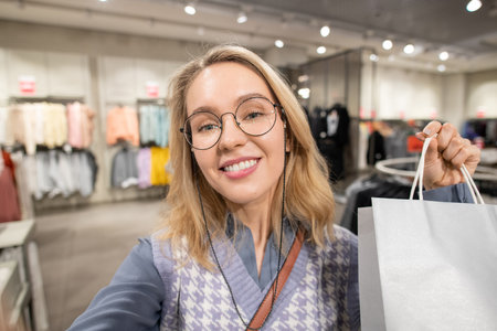 Playful man taking pictures with shopping bags on smartphone while wearing sunglasses and headphones. Modern adult taking selfies with phone after clothing purchase from retail.