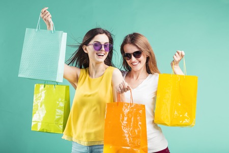 Two beautiful shopaholic smiling girls wears sunglasses holds lot of shopping colorful bags on blue background