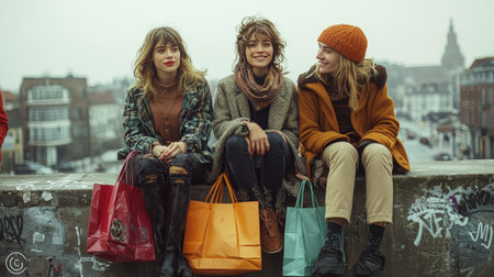 Three women sitting with shopping bags in urban setting
