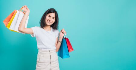 Portrait happy Asian beautiful young woman standing wear white t-shirt, She holding shopping bags multi color on hand and looking to camera, shoot photo in a studio on a blue background