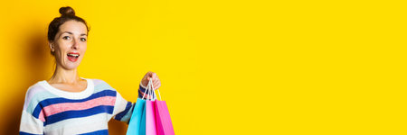 Young woman in sweater holding shopping bags on yellow background.