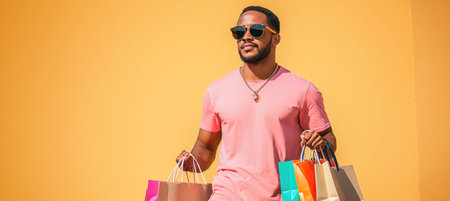 Young man is walking and holding shopping bags in front of a yellow wall