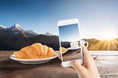 Taking photo of fresh baked croissants and coffee on a wooden table at mountain view.