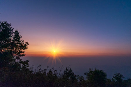 Silhouette of people and tourist during a beautiful mountain sunrise at kiew mae pan, Doi Intanon, Chiangmai, Thailand