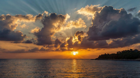 Sunset over the sea with clouds and rays of light in the sky