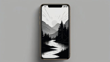 Hands holding mobile phone with landscape view of mountain lake and forest
