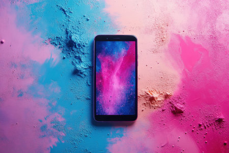 A smartphone rests on a vibrant pink and blue abstract background with textured patches of color.