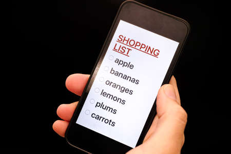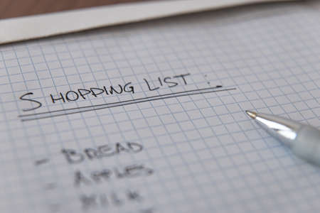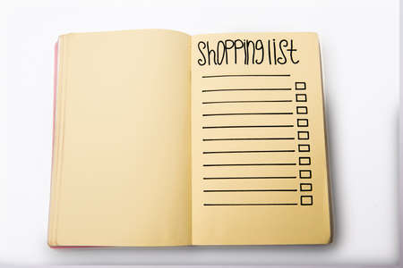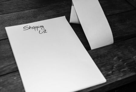 Text Shopping list on paper and empty blank tax receipt on table. Planning savings or business concept.