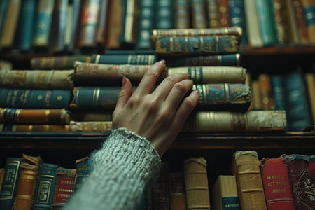 young woman picks up or puts an old book on the shelf. library. selective focus. High quality photo