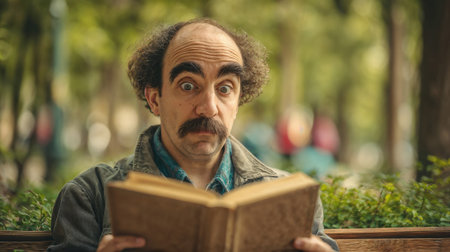Surprised man with mustache reading book outdoors in park showing shocked facial expression with wide eyes and raised eyebrows during leisure time.